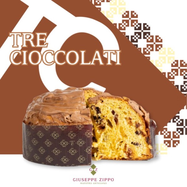 Panettone ai tre cioccolati artigianale con gocce fondente, al latte e bianco e glassa di cioccolato ala latte